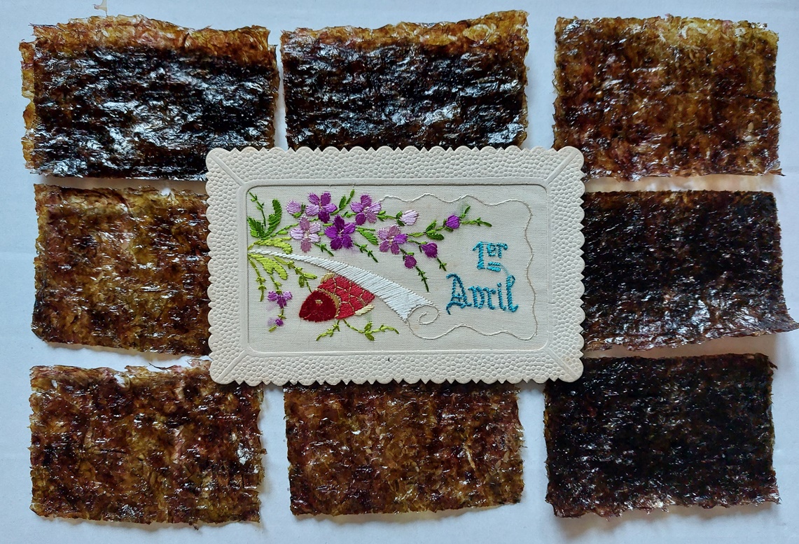 Honderd jaar oude zijdegeborduurde 1-april-kaart uit de Franse traditie.