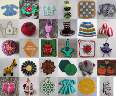 Er zijn aanbiedingen voor Engelse handwerkboeken en aanbiedingen van kleine oude handwerkjes, zoals patchworkjes, kussentjes en tasjes.