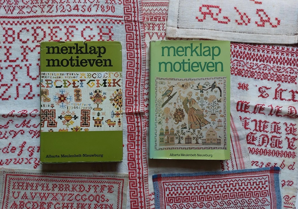 Op mijn blog vertel ik al jarenlang van alles over de handwerkboeken die ik heb verzameld met het doel om ze onder de aandacht te brengen en door te verkopen. Soms presenteer ik de boeken in een collage van acht boeken over een zelfde onderwerp, en vertel ik er in algemene zin wat over. En soms krijgt één boek de volle aandacht in een apart blogje, net hoe het uitkomt of hoe belangrijk dat boek is. Over de boeken met Merklapmotieven van mw. Meulenbelt heb ik al vaak geblogd, omdat het zo’n belangrijke uitgave is. Dus die hoeven eigenlijk niet nòg een keer op een blogfoto.