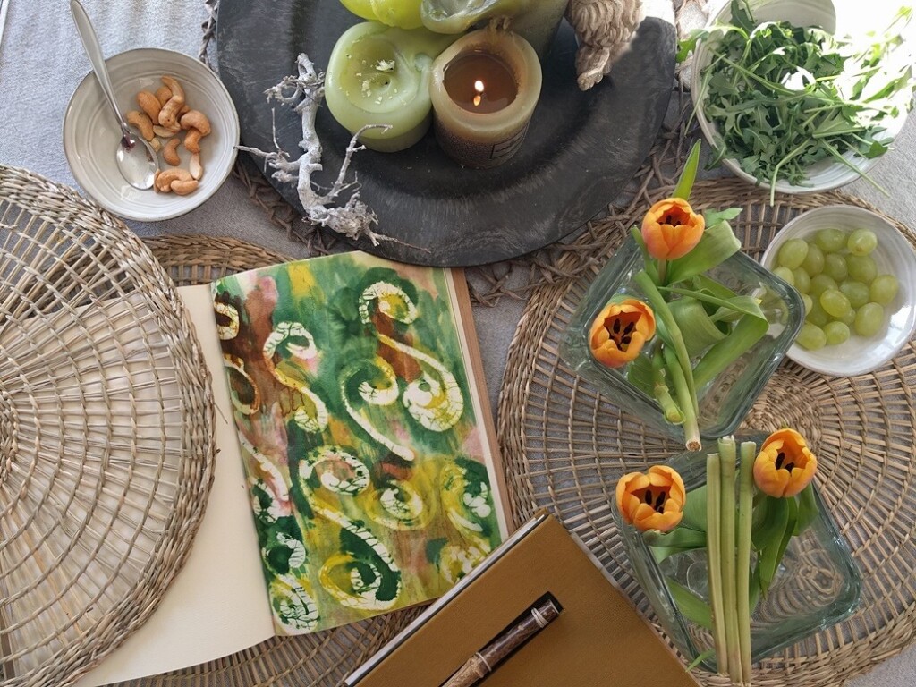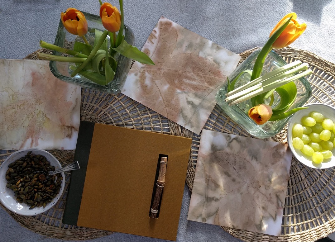 Al gauw ging ons gesprek niet meer alleen over handwerk, maar kwam ook de ontwikkeling ter sprake die we bij het ouder worden doormaken. Het is niet alleen een leeftijd-ding, zeiden we, maar ook het veelzijdige aanbod in allerlei creatieve mogelijkheden. Wat een voorrecht om daarvan gebruik te kunnen maken! Ook voor Maria (bij wie ik te gast was) geldt dat ze vroeger veel volgens de klassieke manieren heeft gehandwerkt, maar nu is doorgegroeid in wat vrijere en eigentijdse creativiteit. Ze liet me twee boeken zien die ze zelf heeft ingebonden. In het ene boek lagen platen waarop afdrukken van bladeren waren verwerkt, en in het andere boek had ze eigen gebatikte pagina’s ingebonden. Die vond ik zo mooi! Ik nam de foto met de gedachte om dit dan te combineren met wat boeken over batik, maar die gedachte laat ik los. Het is mooi genoeg om het zò te laten zien!