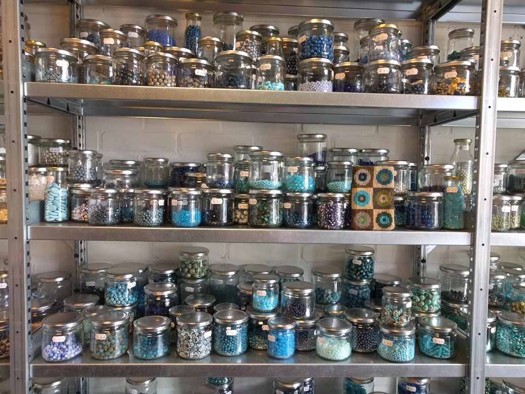 Die zin kreeg ik ook toen ik deze zomer met m’n dochter wat ging drinken in een theetuin in Doesburg. Om bij de binnentuin te komen, moesten we eerst de hele winkel door, en dat was een pleziertje. Want we kwamen door een ruimte waarvan de wanden hélemaal vol waren met potjes kralen! Ik plaatste er een klein “I was here” statement bij. Het is mijn mobielhoesje, en daar zouden best ook wat kraaltjes op hebben gekund!