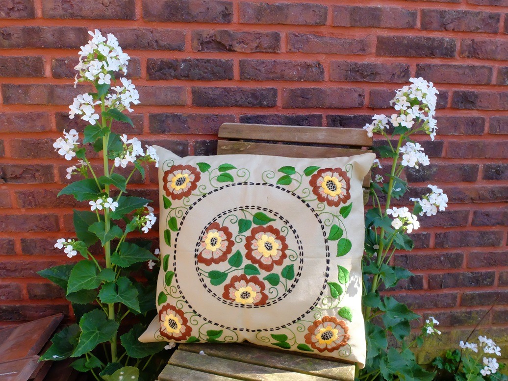M’n kussen nog even: dat maakte ik zelf van een geborduurd Geborduurde bloem in platsteek(tweedehands) kleedje, wat ik veel te mooi vond om in de kast te laten liggen. De foto maakte ik bij de bloeiende Judaspenning. Meestal zie je hem in het paars, maar er is dus ook deze witte variant. Vorig jaar stuurde ik wat zaadjes naar bloglezereressen en ik ben benieuwd of het bij hen opgekomen is. Het is een plant die zichzelf uitzaait en ik laat hem gewoon bloeien waar hij opkomt, en dat was nu strak tegen de muur aan. Omdat ik dat óók ‘beeldig’ vind staan.