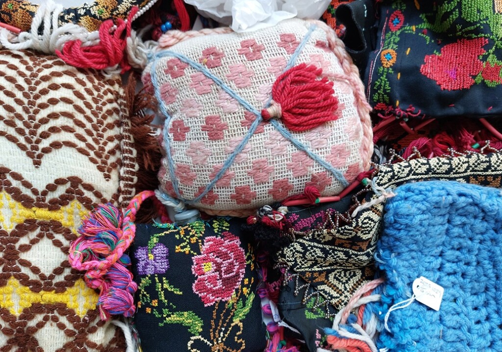 En een doos met hoesjes voor ‘cohlbottles’ uit Syrië. Kool wordt al eeuwen gebruikt door vrouwen uit het Midden-Oosten om hun ogen zwart te maken. Ik wist niet dat daar ook zulke mooie hoesjes voor werden gemaakt. Nelleke zag een overeenkomst met het zogenoemde Zweedse Huck-borduren bij het geborduurde hoesje links op de foto hieronder. Met bruine wollen draden is ook telkens een draadje van de geweven stof opgelicht om er onderdoor te gaan met een naald.