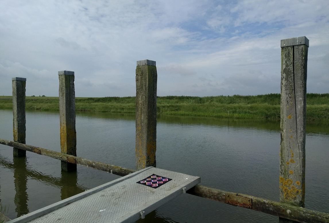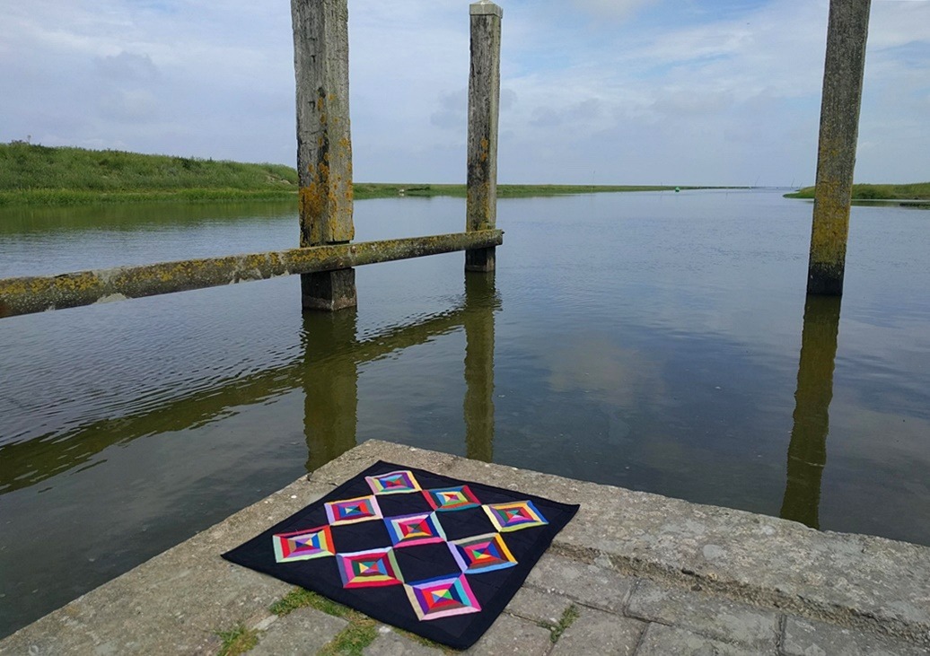 Ik had een oud quiltje mee. In deze setting noodt het tot mijmeren. Waarom maakte ik destijds zoveel van die streepjes-kleurtjes-quiltjes? Toen ik het quiltje daar neerlegde, in een haast eerbiedig gebaar op de zondagochtend, op het uiterste puntje van de kade, werd mij een nieuw antwoord duidelijk. Het was toen ook al de behoefte om orde in de chaos te scheppen. Al die restjes lapjes wilde ik in rechte en schuine patronen, waardoor harmonie en een nieuw evenwicht ontstond. Dat gaf mij voldoening. De quiltjes die ik destijds maakte zijn mij dierbaar en af en toe neem ik ze mee.