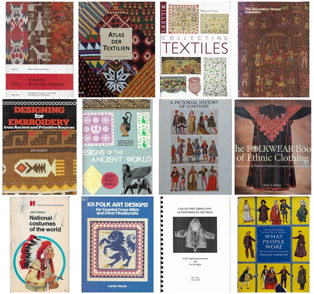 En prachtige boeken over wat er wereldwijd aan ‘costume’ en ‘ethnic clothing’ en ‘dress’ is gedragen, ingedeeld per werelddeel, land, groep, clan of cultuur. In deze boeken zijn de foto’s vaak bijzonder mooi en boeiend.