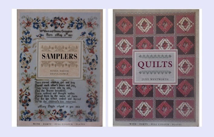 Twee boeken met hele mooie platen, die de rijke en soms verbazingwekkende traditie van fijn-geborduurde merklappen en fraai-gemaakte quilts weergeven. Het boek ‘Samplers‘ toont borduurlappen uit Engeland, en het boek ‘Quilts‘ laat vooral de de Amerikaanse quilts zien. Deze boeken zijn erg mooi om door te bladeren, maar ze hebben ook een nadeel: ze zijn te groot voor de brievenbus. En van het mooie boek met sampler-foto’s laten de pagina’s los van de rug. Toch zijn deze nadelen tegelijk ook een voordeel: want hierdoor kom je op het idee om de pagina’s gewoon helemaal los te maken en ze in te lijsten. Vier of vijf van die pagina’s naast elkaar in een lijstje, dat is vast een mooi gezicht.