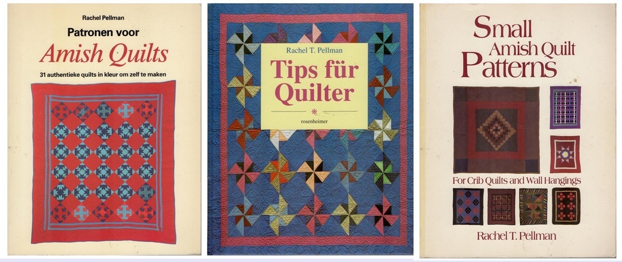 Rachel Pellman heeft denk ik de mooiste en de meeste boeken  geschreven om het erfgoed van de Mennonieten toegankelijk te maken voor de rest van de wereld. Deze boeken werden ook vertaald, en als illustratie hiervan heb ik in deze collage een Engels boek: Small Amish Quilt Patterns. Een Duits boek: Tips für Quilter. En een Nederlands boek: Patronen voor Amish Quilts.