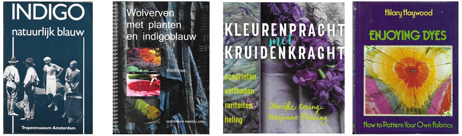 twee nieuwere boeken over het wolverven en het ecoprinten van stof, en nog een Engels boek met de aanlokkelijke titel om Dyes te Enjoyen.