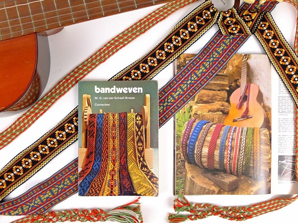 O, m’n oude Yamaha-gitaar! Met een paar kapotte snaren is het wel duidelijk dat ik er al een hele tijd niet meer op heb gespeeld. Dat was vroeger anders: er ging geen dag voorbij of ik zong wel een paar liedjes. Toen ik 15 was ging ik mee met een jeugdkamp waar een paar kampgenoten de kunst verstonden om de sfeer te verhogen middels snarenspel en toen ik thuis kwam wist ik het zeker: Ik wil ook gitaar leren spelen! Die moest dan nog wel eerst worden gekocht en gelukkig mocht ik in de winkel ook gelijk een band uitzoeken. Zodat ik na verloop van tijd ook staande kon spelen, met de band om m’n nek zodat de gitaar precies goed voor me hing. Zo heb ik jarenlang voor groepen en zondagsschool-klassen gestaan maar ook thuis kon ik lekker galmen terwijl ik mijn handen liet wapperen over de snaren. Héérlijk zingen, met volle overgave. En toen kwam er een tijd dat het minder werd, en de gebroken snaren zelfs niet meer werden vervangen. Voorbij, die intense muziek-makerij? Bezig zijnde met m’n handwerkboeken, kwam ik dit tijdschrift (tweede van links boven) over Handweven tegen waarin een beschrijving staat om zelf gitaarbanden te weven. Ik werd helemaal enthousiast. Als ik dat boek vroeger had gehad, dan had ik vast en zeker zelf m’n eigen gitaarband willen weven. Dit plaatje is voor mij een stimulans om in ieder geval een nieuwe snarenset te kopen, en dan ben ik benieuwd wat er verder nog gaat gebeuren. Want als je eenmaal van gitaarmuziek houdt, dan gaat het nooit meer over.