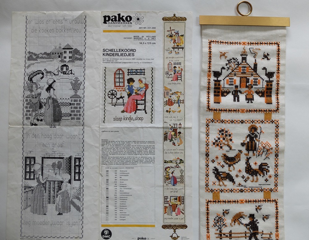 Oud hollandse liedjes met hoge nostalgiewaarde en herkenningseffect! Van zes bekende liedjes werd een kruissteek-tafereeltje ontworpen en samen met de beginregel konden die onder elkaar geborduurd worden op een schellekoord. Ik kreeg een vraag uit Amerika van iemand die ‘zoiets’ zoekt. Ik weet niet precies of ze met ‘zoiets’ dit schellekoord bedoelde, maar ik maakte deze foto en nu ga ik haar eerst even mailen. Maar als dit niet is wat ze zoekt, dan plaats ik het patroon later (voor anderen die dit misschien zoeken) in m’n shop.