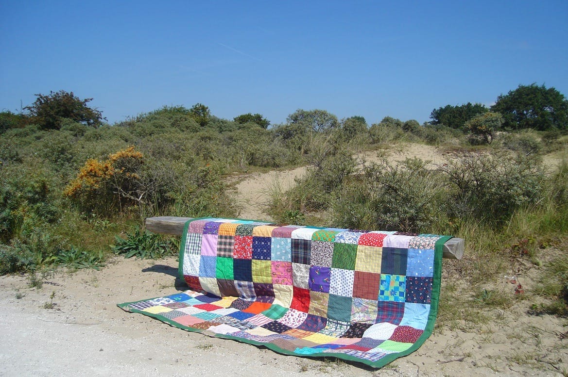 Heb je moeite met het typische sombere novemberweer? Even een kijkje op mijn blog, en je wordt weer vrolijk! Ha, ik ga ook maar eens tekst-schrijver worden. Of ben ik het al? Deze foto is een jaartje of zeven geleden genomen (toen deed ik dat dus ook al), tijdens een wandeling met m’n zus in de duinen. Ik zocht een gepast moment om haar een eigengemaakte lappendeken te overhandigen en dat moment vond ik tijdens die wandeling. “Hier zus, ik heb wat voor je gemaakt! Kan je ook net als ik ook overal je picknickkleed neerleggen en ophangen.” Net als ik? Waar was mijn eigen picknickkleed dan eigenlijk? Ik had het nog niet echt gemist, maar ook zonder gemis kwam het nu tevoorschijn. Het lag achter een houten kist onder de kapstok die we van z’n plaats trokken. De kist ging weg, en alles wat eruit kwam moet op een andere plek opgeborgen. Maar och help: er lag ook nog een heleboel àchter die kist! Dat moet nu ook allemaal weer een nieuw plekje krijgen. En nu weet ik ook wel weer hoe het kwam dat mijn lappendeken erachter was gegleden. Ik neem hem vaak mee in de auto, maar soms moet de auto dan weer even leeg en leg ik hem onder de kapstok en als de kist dan opengaat dan glijdt hij weg en merk ik daar niks van. Nou, genoeg gepraat; ik moet aan het werk en heb nog een heleboel op te ruimen hier in huis. Maar eerst wou ik mezelf even opvrolijken, en hopelijk jullie ook. Met een vrolijke lappendeken op een regenachtige novemberdag! Fijne dag!