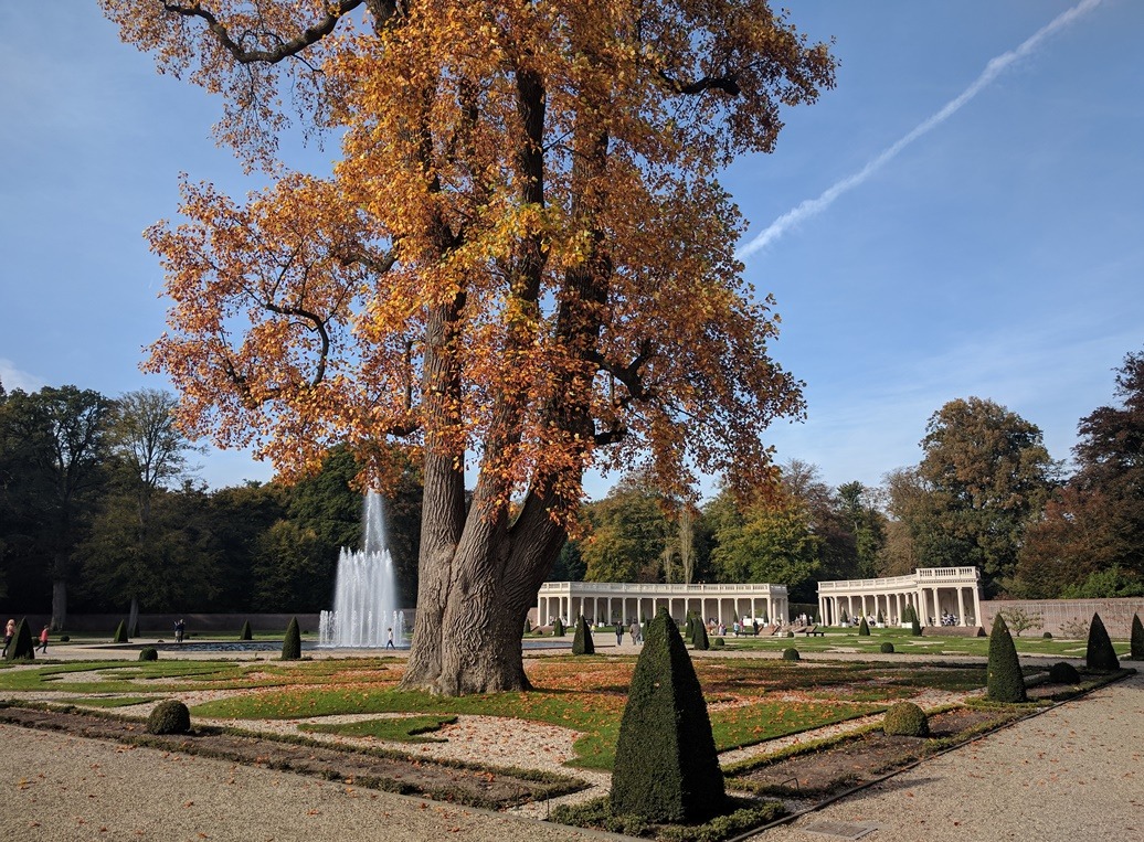 Terug naar gister. De mooi verkleurde bomen, de prachtige tuin, genieten van het zonnetje. Het was zo’n dag dat veel meer wandelaars elkaar groetten en in gesprek raakten. “Geniet er nog maar van, want morgen is het voorbij”, zei iemand anders tegen me. Dat heb ik gedaan. En ik schoot lekker weer een stukje op met m’n borduurwerk. Niet voor het paleis, maar wel paleiselijk!