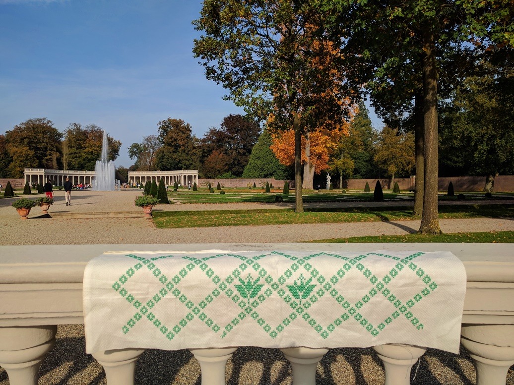 “Borduurt u voor het paleis?”, vroeg een oudere mevrouw aan me. Ik schrok op, en was even helemaal verbaasd. Ik zat daar aan het uiteinde van de witte galerij, en had m’n stoeltje zo geplaatst dat ik uitkeek over de hele tuin. ’s Morgens had ik een afspraak gehad en na afloop besloot ik om niet naar huis te gaan, omdat daar zoveel herrie was. En ik was al in de buurt van het paleis, dus daar zat ik dan weer. Een prachtig plekje! En dan die vraag van die mevrouw: “Borduurt u misschien voor het paleis?” Haha, dat zou wel grappig zijn!