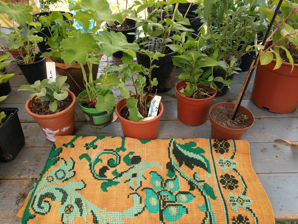 Toevallig had ik juist een mailtje gelezen van iemand die schreef over het borduren op jute. Vroeger was er speciaal handwerk-jute waarop borduurwerk heel fraai uit kan komen. Zo’n kleed als dit had ik nog niet eerder gezien.
