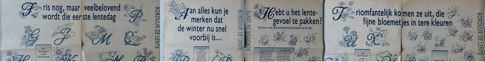 In de tijd dat deze gratis borduurpatroontjes om een lente-alfabet te borduren werden gepubliceerd, bestonden er nog geen blogs. En geen Pinterest, waarop mensen hun ideeën konden bewaren. Het enige wat je deed was iets uitscheuren als je iets mooi vond, en dan bewaarde je dat in een mapje. Er zijn veel vrouwen geweest die de leuke ideetjes (“die-ze-ooit-nog-eens-wilden-maken”) uitscheurden. Vaak werden die tijdschrift-velletjes later alsnog weggedaan, en soms komen ze via veel omzwervingen bij mij terecht. Ik heb nu een doos vol met dit soort uitgescheurde tijdschrift-patronen. Ik was pas bezig om wat te sorteren (een hele klus) maar schuif het nog even voor me uit om daar verder mee te gaan.
