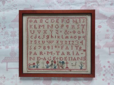 Nog steeds vind ik het af en toe leuk om een oud borduurwerkje van een ander op te knappen. Als ik iets tegenkom waarvan ik denk ‘ach, dat hoeft alleen nog maar een randje’, dan is het besluit al bijna genomen. “Alleen maar een randje”, en dan al gauw een leuk resultaat. Nu heb ik me dus met dit petitpoint-huisje bezig gehouden. Een lief tafereeltje van huisje-boompje-beestje.