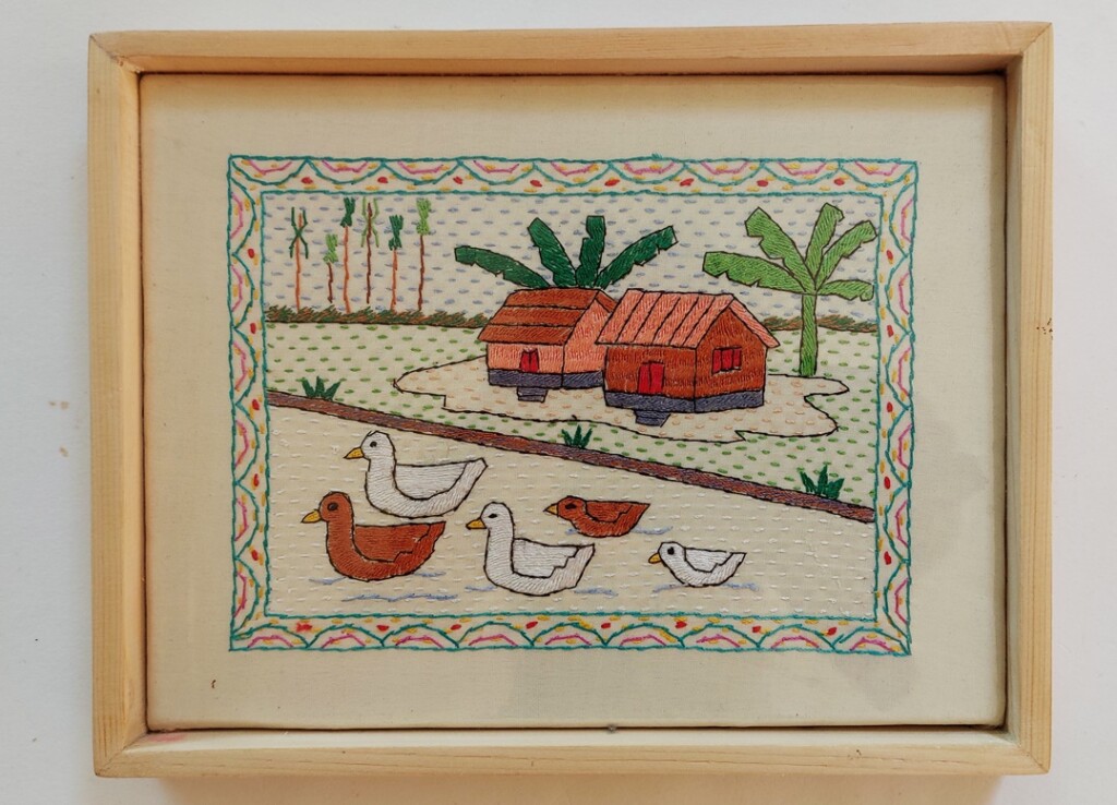 Een stikker achterop vermeldt dat dit een borduurwerkje is uit Bangladesh. Ik vind het schattig! Deze foto had ik vorig jaar klaar liggen toen ik bezig was met boeken over etnisch handwerk. Daar ga ik straks wel weer mee verder. Wat ik wel opvallend vind: ik kom vaker boeken tegen over handwerk uit het buitenland, dan handwerkjes zelf. Het meeste wat we hier kunnen vinden is waarschijnlijk speciaal gemaakt voor de toeristenindustrie, en meegenomen als souvenir. Maar daarom niet minder authentiek! Leuk om te zien welke vrije borduursteken zijn gebruikt voor een lief tafereeltje.