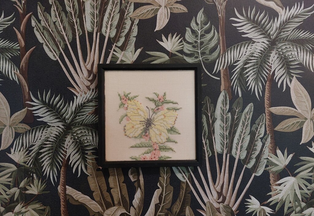 Mijn oog viel op een bekend ingelijst geborduurd vlindertje: die heb ik ook een paar keer in mijn shop gehad.