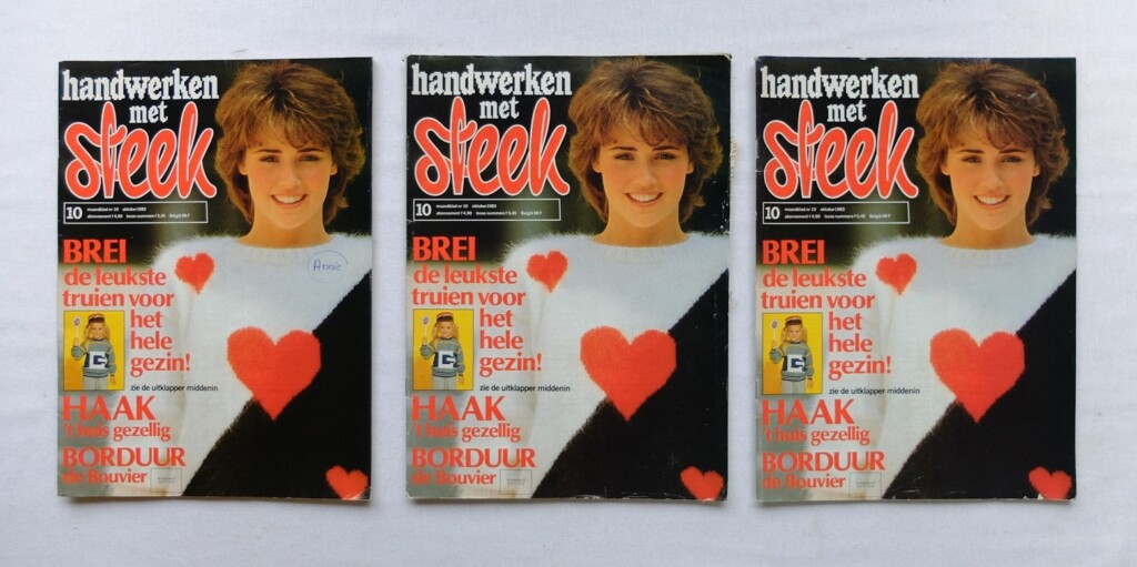 Op de achterkanten van deze nummers van begin jaren tachtig, stonden borduurpatronen van een hond of een kat.