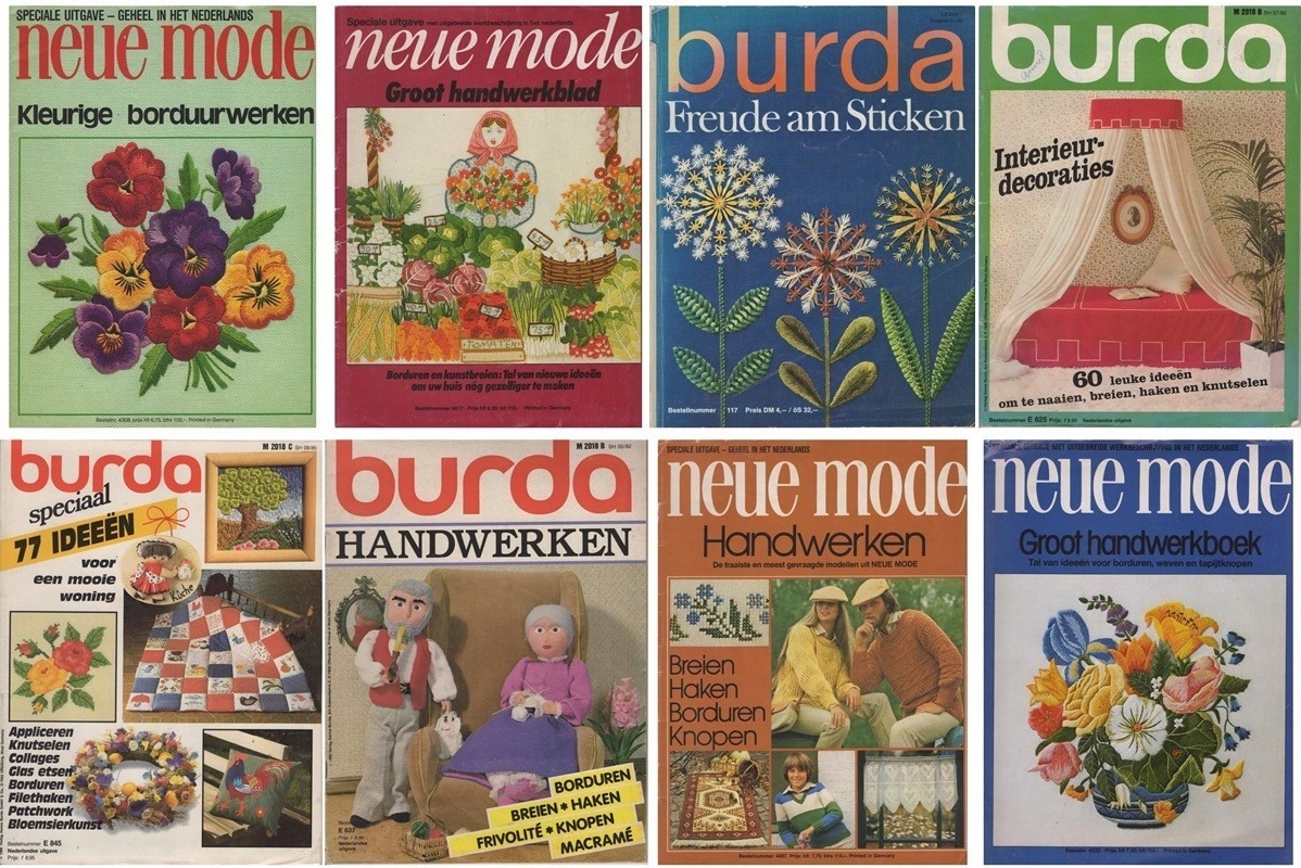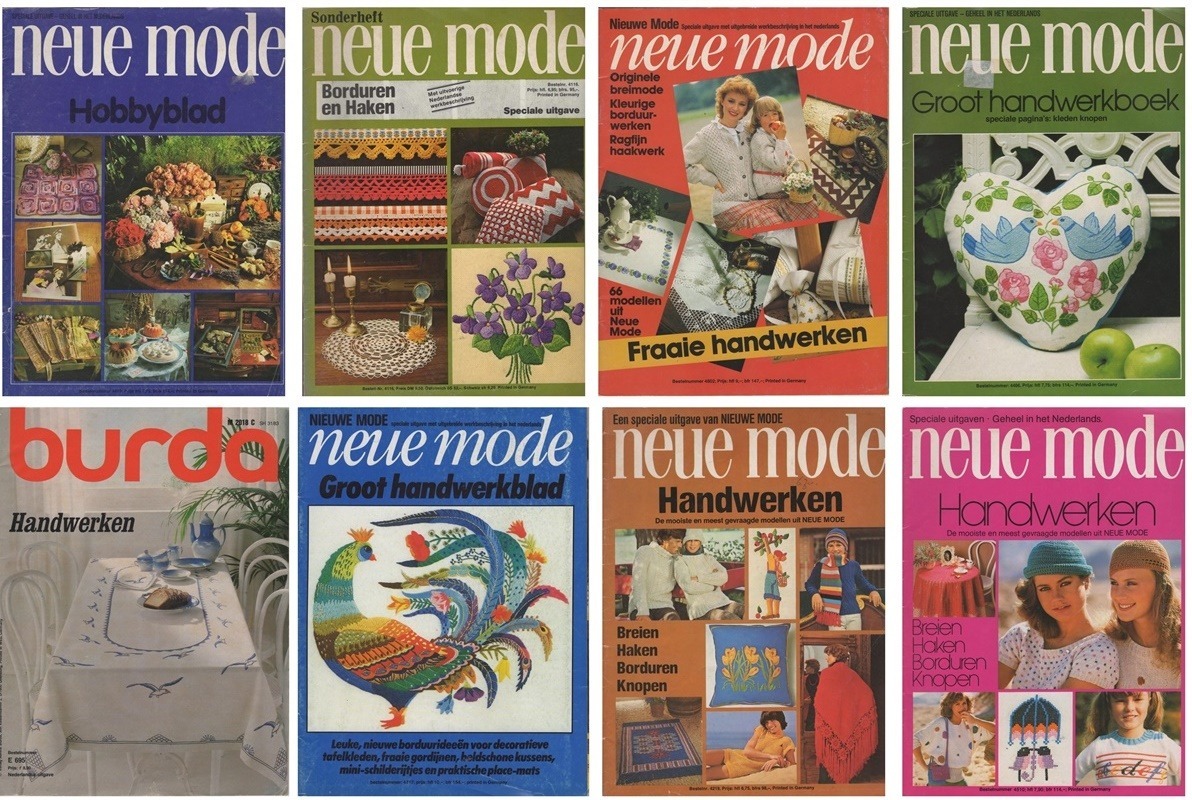 Het zijn tijdschriften uit het Duitse buurland-handwerkland die door Burda en Neue Mode ook in ons land werden verspreid. Vaak werd het hele tijdschrift vertaald en opgemaakt in het Nederlands, en soms alleen de werkbeschrijvingen. Typische handwerken uit de zeventiger en tachtiger jaren die nog steeds mooi zijn om te zien en te maken. Een tijdlang heb ik deze ouwe gouwe tijdschriften opgespaard en nu allemaal in m’n shop geplaatst.