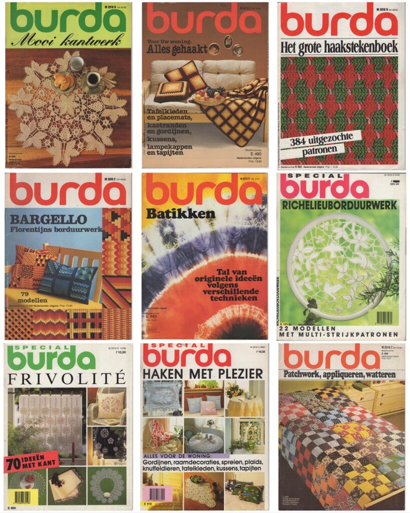 Burda had (en heeft) zoveel handwerkkennis in huis dat ze specifieke tijdschriften konden maken die zich focussen op één onderwerp. Ik heb er een tijdje voor ‘gespaard’ om deze Specials nu allemaal in één keer te kunnen aanbieden, want zo vaak kom je ze niet tegen. Voor alle Burda’s geldt dat de kennis over de technieken op deskundige wijze wordt aangeboden en dat de foto’s altijd mooi en aantrekkelijk zijn. Van sommige handwerk-onderwerpen, zoals haken, is het niet zo vreemd dat er een apart tijdschrift aan werd gewijd want daar zijn talloze tijdschriften over verschenen. Maar van andere onderwerpen is het wèl bijzonder dat daar een aparte special over werd gemaakt, zoals Frivolité, Richelieu, Batikken en Bargello.