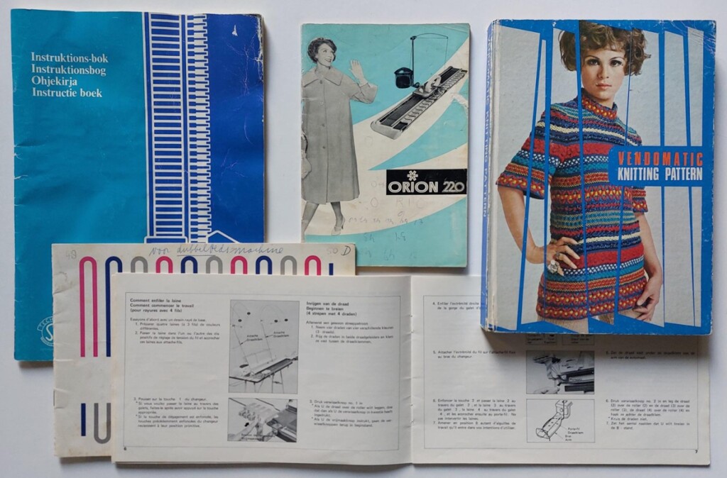 En voor mezelf is het natuurlijk ook toch wel weer leuk om een ’tentoonstellings-blogje’ te maken, want meestal zit er dan wel ergens een foto tussen waarbij ik kan aansluiten met één van m’n eigen boeken. In de vitrine zag ik ook zo’n oud breiboek liggen, en het doet me deugd dat die oude boeken door nieuwe vormgevers weer gebruikt kunnen worden. Ik heb deze: Vendomatic Knitting Pattern. Een pareltje voor breimachine-liefhebbers, en een mooie afsluiting van dit blogje.