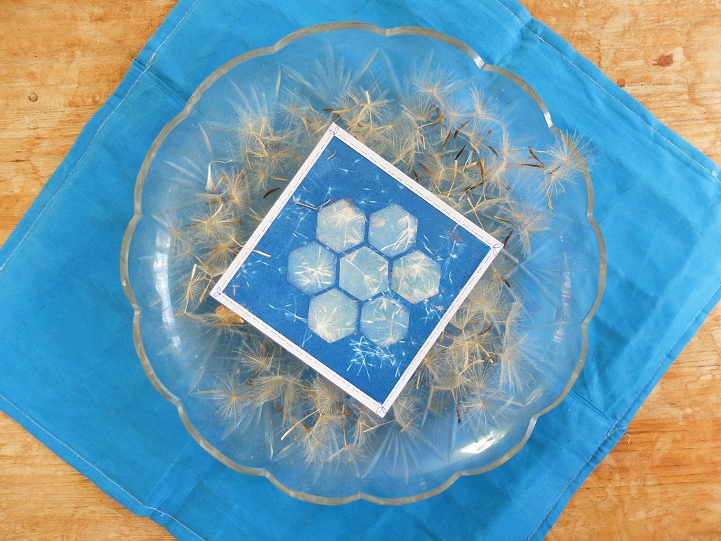 Tineke maakte met pluizen van een andere Morgenster een cyanotype-kaart. Cyanotypie is een fotografisch proces waarbij na ontwikkeling een cyaan-blauwe afdruk ontstaat. Die kleur is fantastisch, maar ook telkens een verrassing want het resultaat wordt mede bepaald door hoe lang je iets in de zon legt en ook van de zonkracht van dat moment. Deze uitleg vond ik binnenin de kaart opgeschreven door Tineke.