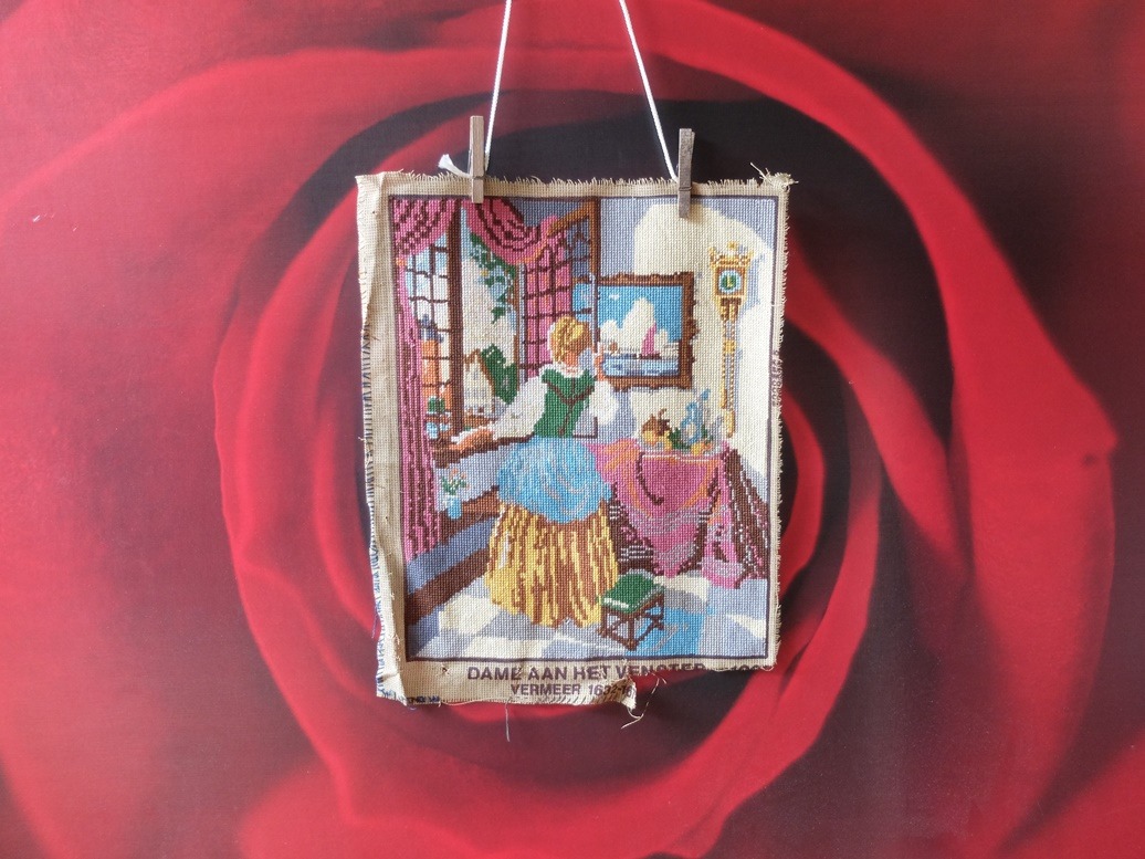 In een oud fotomapje (dit keer uit 2017) kom ik een foto tegen die ik nooit gebruikte, en die ook eigenlijk wel een beetje raar is. Natuurlijk heb ik in de loop der jaren van alles uitgeprobeerd en soms maakte ik foto’s die ik bij nader inzien te gek vond. Bij deze foto weet ik het gelijk weer: we hadden zo’n enorm grote Ikea-roos, die tien jaar geleden bij veel mensen in de kamer hing. De onze moest maar eens weg, na al een paar jaar naar zolder te zijn verbannnen. Eerst nog eens kijken of ik er wat mee kan, dacht ik, en zo hing ik er een geborduurde Vermeer-dame voor.