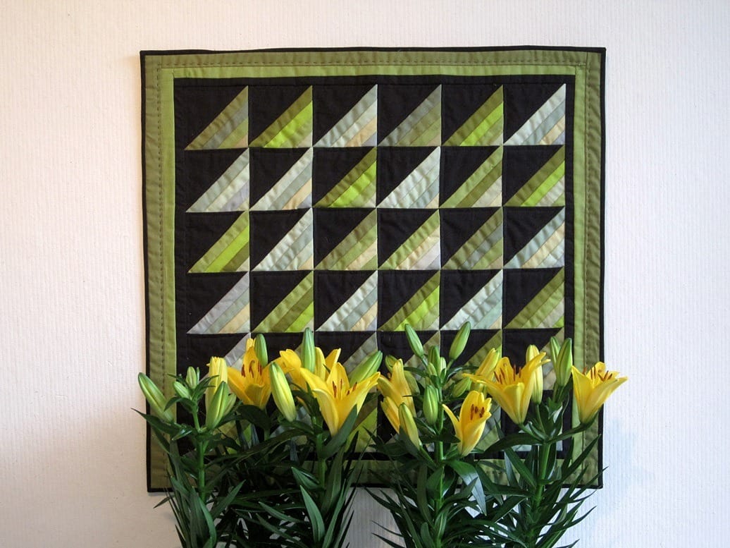 De kleuren van de lente probeerde ik te vatten in dit quiltje. De rijk geschakeerde natuur laat nu duizenden tinten groen zien, en iets daarvan wilde ik weergeven met mijn lapjes.