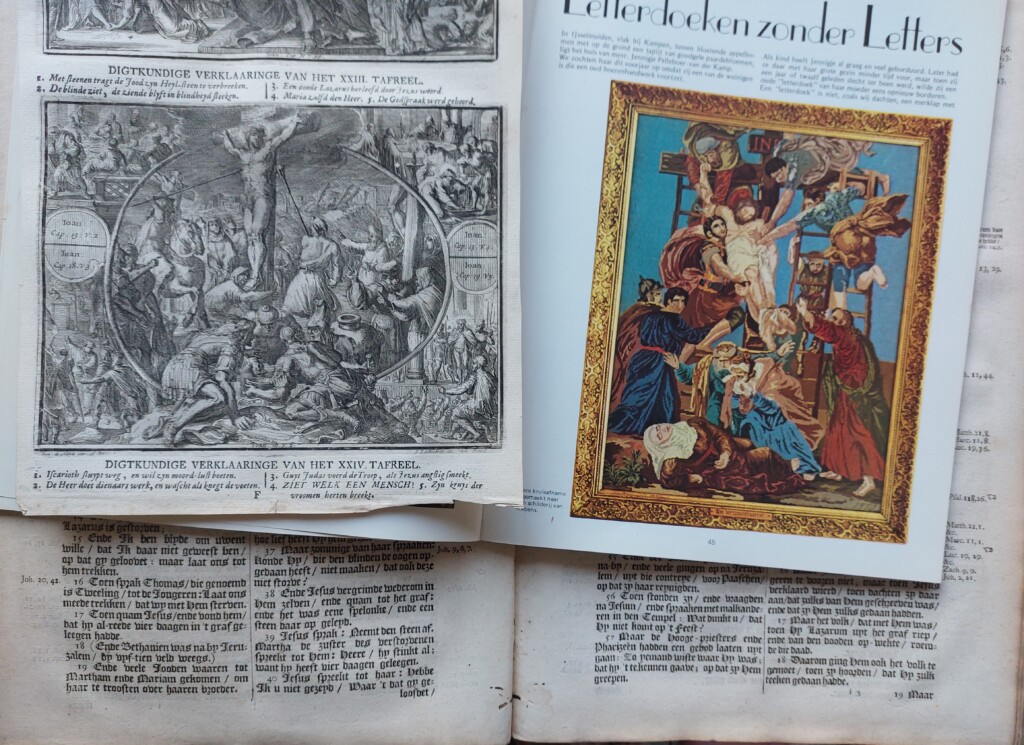 Ook bordurende vrouwen sloten zich aan bij het diep-doorleven van wat daar, tweeduizend jaar geleden, gebeurd is. Toen er een nieuw genre in de borduurkunst was ontstaan, ongeveer tweehonderd jaar geleden, werden beroemde schilderijen omgezet in borduurpatronen. Allerlei taferelen uit de geschiedenis en ook uit de bijbelse geschiedenis konden worden geborduurd. Nog in de zeventiger jaren beoefende een vrouw uit Kampen deze borduurkunst. Zij borduurde de kruisafname. Het tijdschrift Handwerken zonder Grenzen besteedde er aandacht aan in het zesde nummer (uit haar geschiedenis). Het artikel heet: Letterdoeken zonder letters. Een doek wat een verhaal vertelt.