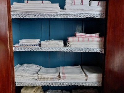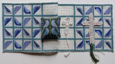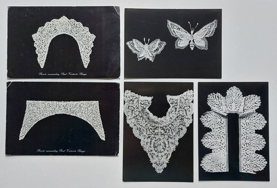 En van naald- of kloskant uit Nederland en België. Daaronder vier kaarten met foto’s van stukjes kant die voor Nederlandse streekdrachten werden gebruikt.