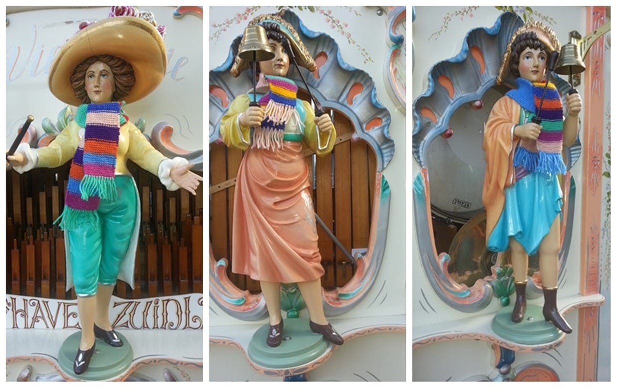 Alles en iedereen doet mee met de breimode! Ook de draaiorgel-poppen! Deze foto’s werden gemaakt door m’n dochter en stuurde ze me toe per app. “Zult u vast wel leuk vinden, mam!” Ja dat klopt, zulke foto’s vind ik erg leuk om te zien (en te laten zien!). De dochter had gelijk maar even een praatje gemaakt met de orgelman en zo kwam ze te weten dat de dasjes werden gebreid door zijn vrouw.