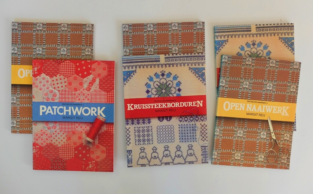 De serie ‘Textieltechnieken’ behandelde uitgebreid de basis en de mogelijkheden van de afzonderlijke technieken. Margit Reij was in de tachtiger jaren een bekende naam van iemand die vanuit praktijkervaring de kunst verstond om alle fijne kneepjes van een techniek te laten zien, en de uitgever maakte er een paar mooie boekjes van. Ik vind het altijd leuk om te zien dat sommige oude handwerkboeken die ik tegenkom ‘bij elkaar horen’ omdat ze van eenzelfde serie zijn. Dan wacht ik een tijdje voordat ik erover blog, om te kijken of er misschien nog meer deeltjes opduiken, maar bij mijn weten is deze serie niet groter geweest dan deze drie: Patchwork, Kruissteekborduren en Open naaiwerk. (het eerste en het laatste deeltje voeg ik nu toe aan m’n shop).
