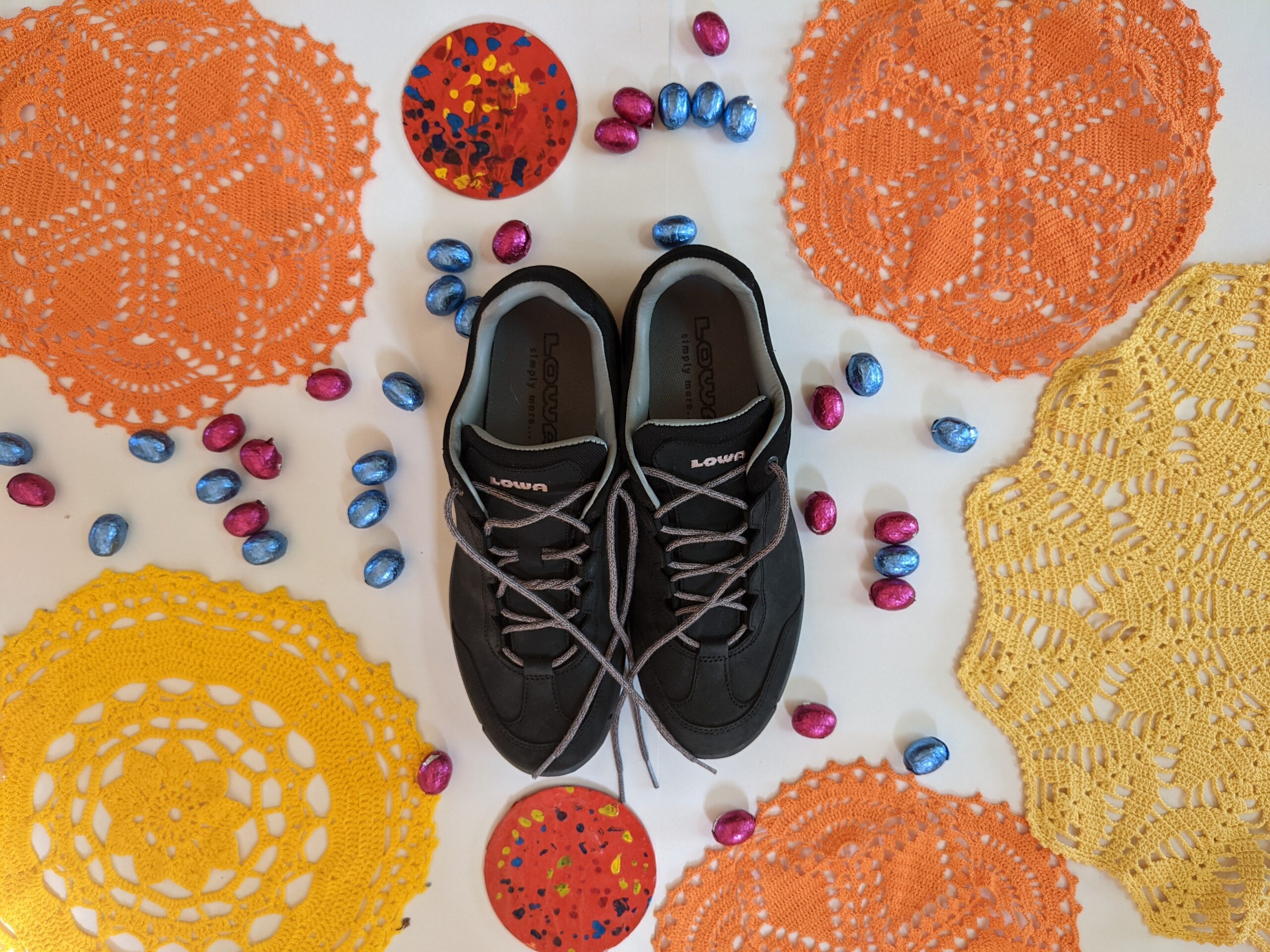 En op deze vrolijke zonnige dag had ik een afspraak in een schoenenwinkel. Wat was het leuk om nieuwe wandelschoenen te kopen! De schoenen die mij werden aangereikt zaten heerlijk, maar ik twijfelde wel even bij dat zwart. Liever iets met een kleurtje? probeerde ik. Maar nee, dat was er niet in mijn maat. “Komt er later misschien nog wat binnen?” vroeg ik nog. Maar nee, daar kon ik ook maar beter niet op wachten, zei de verkoopster. “De schoenen vliegen de deur uit, en er is al een wachtlijst tot juni voor bepaalde schoenen.” Toen besloot ik maar gewoon blij te zijn met goed-passende schoenen, en voor de kleurtjes in huis zorg ik dan zelf wel!