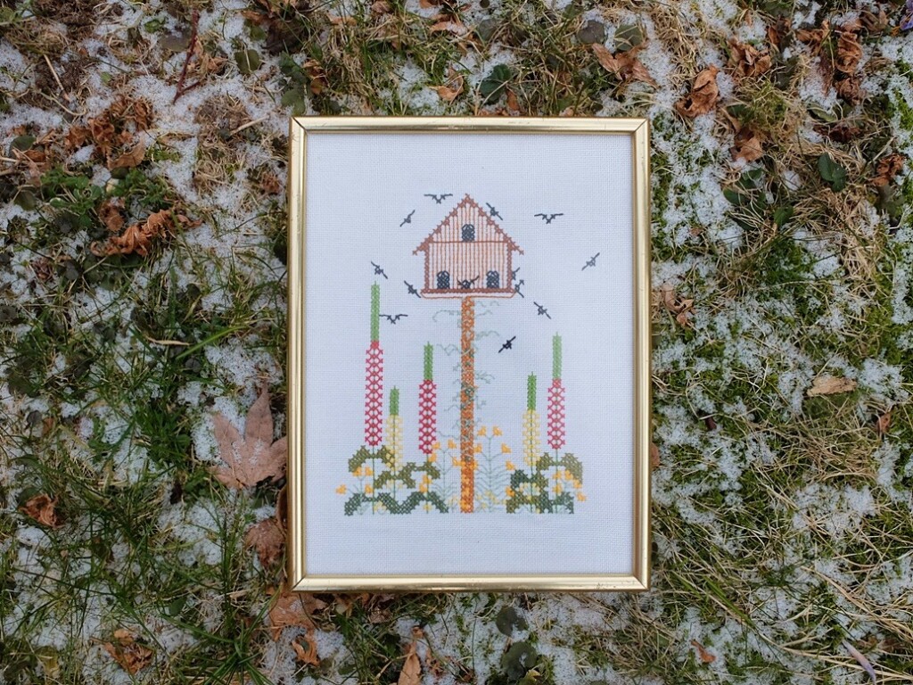 Onder het vogelhuisje bloeien de bloemen al, maar zover is het nog niet.