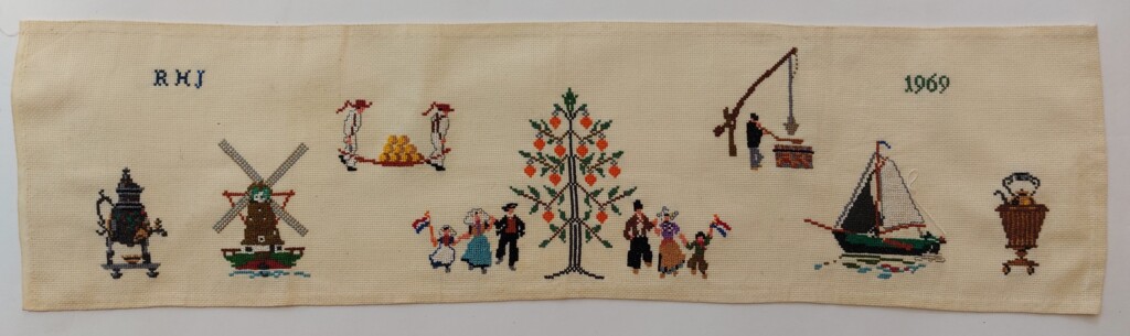 En altijd gebeurt er wel weer iets waarbij een jaartal belangrijk wordt gevonden om te blijven herinneren. Er kan in een jaar veel gebeuren, een grote omslag plaatsvinden of een belangrijke gebeurtenis. Wat voor RHJ belangrijk was in 1969 zullen we vast niet meer achterkomen. Het lapje wat iemand borduurde, met oud Hollandse motieven, is leuk om even te zien en de heimwee te voeden naar ’toen-Nederland-nog-overzichtelijk-was’. Vooral als er weer eens een kabinet is gevallen, zou je wel willen dat het allemaal wat simpeler was. Voor een dagje uit ging je vroeger een kijkje nemen op de kaasmarkt, koffie dronk je bij oma uit de kraantjeskan, een ritje langs de molen was genoeg om weer opgeladen te zijn, en een tochtje met een zeilboot was niet voor iedereen weggelegd. Maar ik denk dat ik nu aan het overdrijven ben want deze oud Hollandse plaatjes (naar ontwerp van Mies Bloch) waren toen ook al nostalgisch.