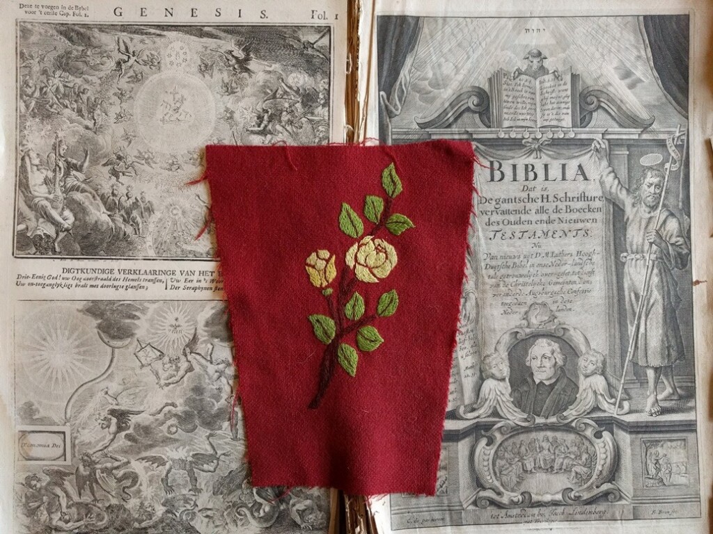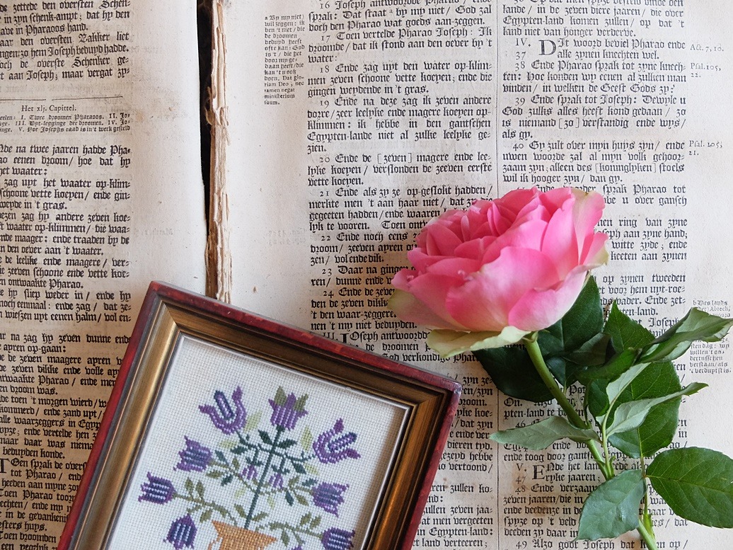 In onze familie hebben we een oude familiebijbel. Het is een Lutherbijbel uit 1702, uitgegeven door Lindenberg in Amsterdam. Het is een bijbel die veel heeft meegemaakt. Liever gezegd: de familie heeft veel meegemaakt (we weten alleen niet zo goed wàt allemaal) en dat is te zien aan de staat van de bijbel. Hij ligt een beetje uit elkaar, maar hij is toch kostbaar voor ons. Mijn zus heeft hem van onze grootmoeder geërfd, maar de afgelopen vijf jaar lag hij bij mij in huis. Gisteravond vroeg m’n zus of ik hem mee wilde nemen, want ze heeft nu een nieuw huis en daar kan hij beter liggen dan in haar oude. Dus maakte ik nog een paar foto’s. Van borduurwerkjes die óók kostbaar voor me zijn en die herinneringen zijn aan mijn voor-familie. Nog één keer kan ik ze op de mooie oude platen uit deze familie-bijbel leggen.