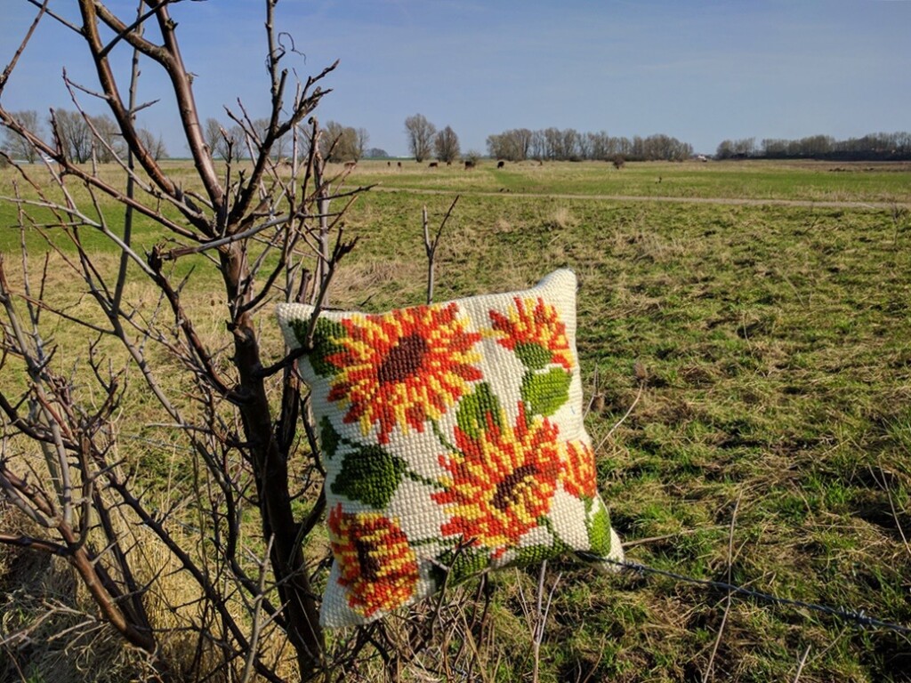 Op de dag na de verkiezingen zat ik al om zeven uur in de auto. Na enige werkzaamheden bij de tandarts was het tijd voor een lentefeestje bij de Waal. Die ‘werkzaamheden’ hoefde ik niet zelf uit te voeren, maar ik was er toch moe van geworden. Na afloop ga ik dan altijd even bijkomen op een mooi plekje. De brandrode runderen waren er weer, het lentezonnetje scheen en het was tijd voor een vrolijk oranje kussen. Dit fijne auto-en-picknick-kussen plaats ik in m’n shop. Past bij Hollandse vrolijkheid op een stralende lentedag!