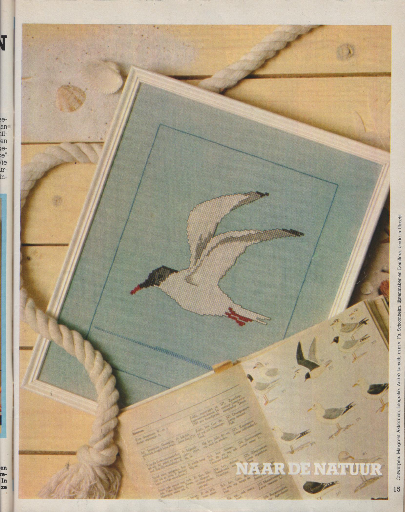 De prachtige meeuwen komen uit Ariadne van augustus 1982. Ze worden extra mooi als je ze borduurt op een lichtblauwe ondergrond. Ik vond het leuk om dit oude patroon weer tegen te komen.