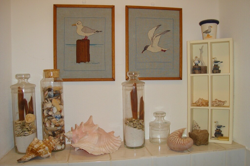 Lang geleden: ik was op een eiland en daar lagen een heleboel lege Nautilus-schelpen. Ik wilde er heel graag één mee naar huis nemen en stopte hem vol met zand en rolde hem tussen m’n kleren in de koffer. Ik wist niet of dat wel mocht maar ik wilde het ook niet weten want ik was vrij vastbesloten dat ik deze schelp wilde meenemen. In Australië moest ik overstappen en dat vond ik wel spannend, maar m’n koffer hoefde gelukkig niet open. En zo kwam de Nautilus schelp op het richeltje te liggen en daar ligt hij al bijna twintig jaar. Een tijdlang hingen de schilderijtjes die m’n zus borduurde erboven en ik vond het wel een mooi geheel. Het is een oude foto, maar ik zocht hem op voor dit blogje.