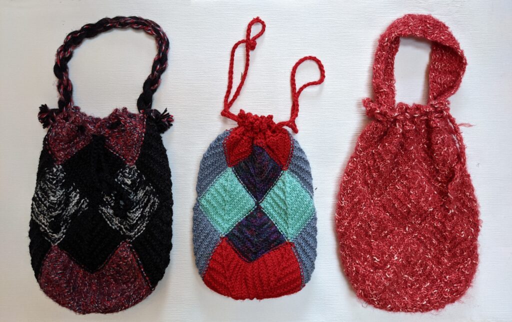 Aan het eind van haar blogje over dit buideltasje schrijft ze: Let op, het kan verslavend werken! En zo zal het ook zijn gegaan bij de mevrouw die deze drie tasjes breide. Ik kreeg ze deze week en vind het leuk om ze te laten zien. Straks komen ze in m’n shop, en dan kunnen ze naar drie tasjes-liefhebbers, maar wie weet is dit blogje ook wel weer inspirerend voor anderen om zelf ook zoiets te breien. Want het is opmerkelijk hoe zulke trends telkens weer opvlammen met een jaar of tien ertussen.