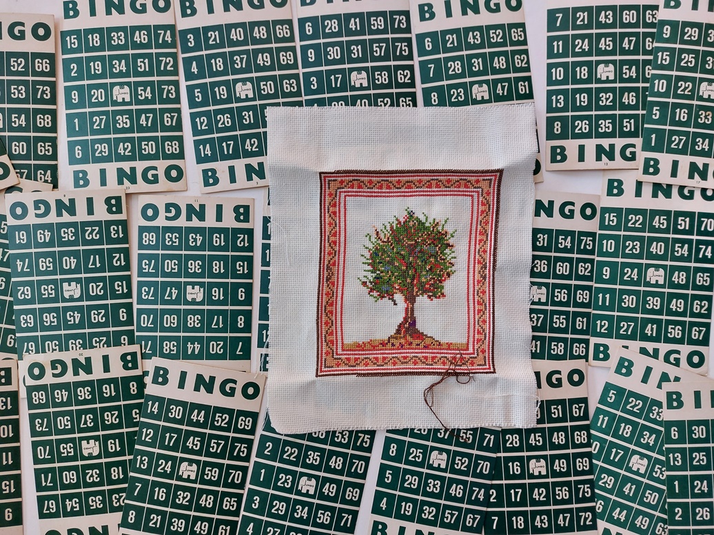 Als ik in een sombere bui ben, dan denk ik: Hoe groot is nou de kans dat ze die belofte waarmaken? Dan denk ik: 3 of 4 procent. Ze doèn het gewoon niet. En klagen helpt ook niet. Nu ben ik een borduurwerkje van zo’n mooie boom aan het omheinen met een afwerkrandje. Een leuk klusje, want ik heb er gewoon helemaal zèlf zicht op! Ik kan die rand zo maken als ik wil, en nog een beetje dromen over een grote boom die nooit meer in mijn uitzicht zal staan. Ik borduur nog even verder en denk intussen aan de missende bomen, waar ik al die jaren in het voorjaar tegenaan keek.