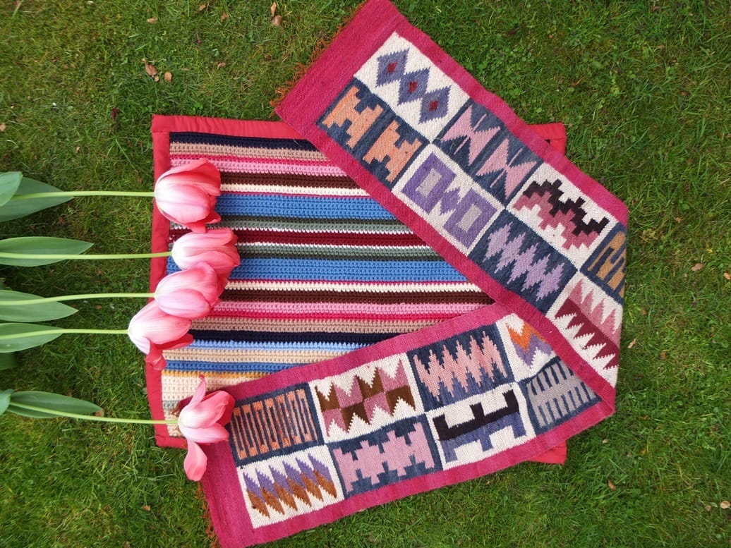 Ik fiets door een stille straat nabij het stadscentrum op zaterdagochtend. Het valt me op dat het in deze straat drukker is dan anders en dan zie ik de aankondiging vlakbij een kerk: Ha, fijn, rommelmarkt! Ik kijk op m’n horloge: half elf. O, nog fijner, dan is vast nog lang niet alles weg. Snel parkeer ik m’n fiets op het grind, en wordt vriendelijk gegroet door een paar mannen die daar auto’s aan het wassen zijn. Allemaal voor het goede doel. Vol verwachting (want van een onverwachte rommelmarkt krijg ik verwachtingsvolle gedachten) loop ik naar de ‘rommel’. Nòg meer vriendelijkheid. Ik ben nog wat te vroeg voor de saté die net op de barbeque wordt gelegd (buurt-rommelmarkten in oude kerken zijn vaak zò gezellig!), maar ik ben nog prima op tijd Gehaakt en geweven kleedjesom dit leuke kleedje van de grond te rapen. Wat ben ik daar blij mee! Het zal vast door iemand een keer zijn meegenomen van een verre vakantie. In mijn tuin leg ik het bij mijn gehaakte kleedje/dekentje wat ik kort geleden hier liet zien. Kleurt mooi! In tegenstelling tot dat gehaakte dekentje (wat ik onafgewerkt op een grote rommelmarkt kocht en waar ik zelf een rand omheen naaide) zou ik naar dit nieuwe geweven kleedje nog wel eens navraag kunnen doen bij deze recente rommelmarkt. Die was niet zo heel erg groot en de mensen waren zo vriendelijk. Ik denk dat ik nog eens terugga, en dan ga vragen of zij weten wie dat kleedje heeft meegenomen uit welk land. Het is namelijk te móói om het niet te weten!