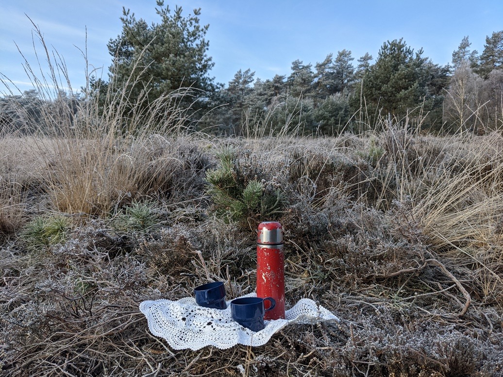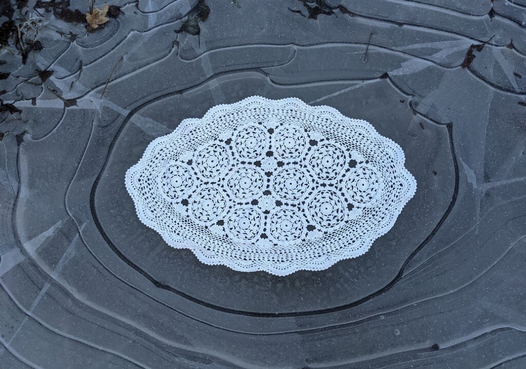 Op onze winterwandeling op de laatste dag van januari had ik een paar van die mooie oude kleedjes mee. De natuur had een plekje bedacht waar een ovaal kleedje prachtig uitkwam. Het was weer zo’n moment van puur genieten. Al die mooie witte gehaakte rondjes worden bijeengehouden in een brede rand, eerst van haakwerk en vervolgens van ijs.