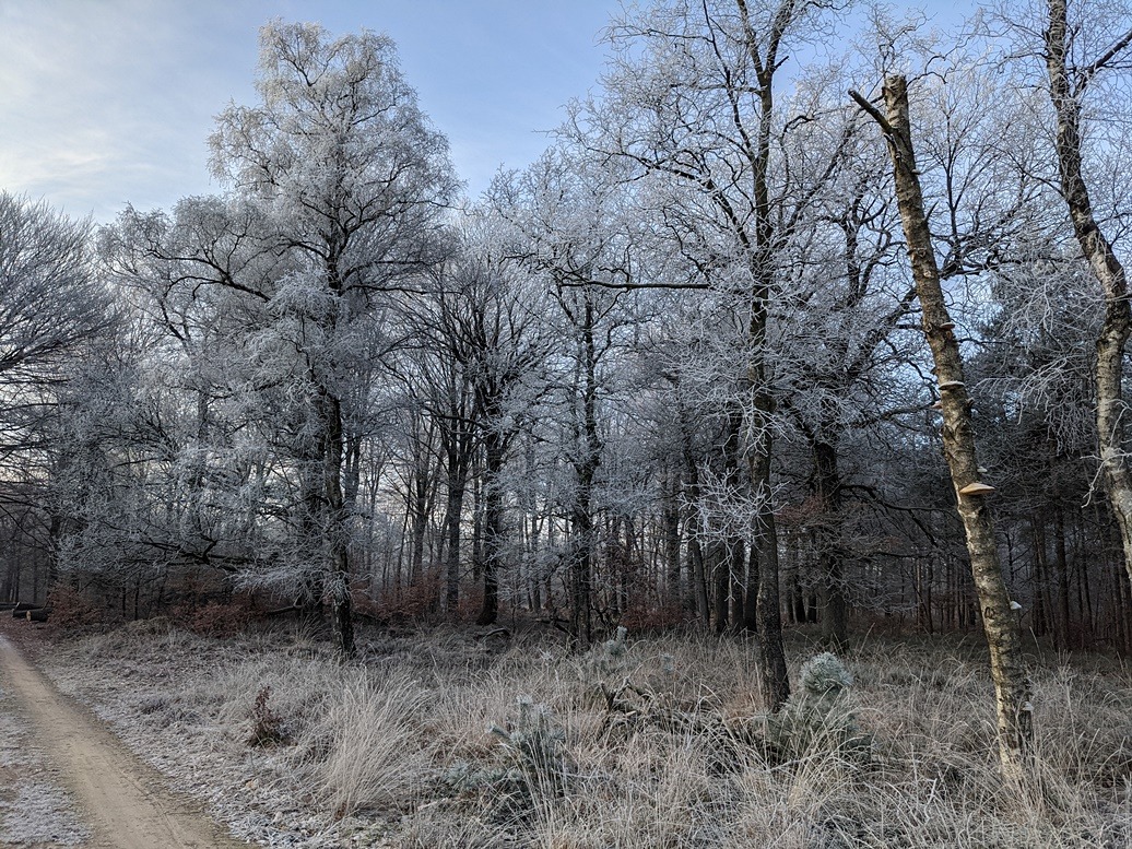 Spel van natuur en temperatuur. Alles bedekt met een laagje rijp. Witte verstilling.