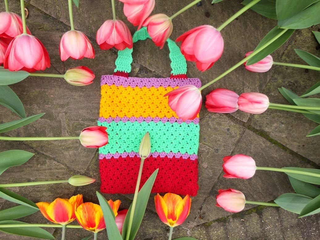 “Wat is er met jou aan de hand” vroegen mijn zussen toen ze mij afgelopen weekend in de pauzes bezig zagen met wat felle bolletjes wol. Toen had ik nog maar twee strepen gehaakt: rood en gifgroen. We waren hard aan het werk voor de verhuizing van m’n broer en terwijl we een snelle boterham aten pakte ik nog een geel bolletje uit m’n tas. Daarbij hoorde ik m’n zus zeggen: “Nee hè, nu ook nog geel erbij?” Want zij houdt niet zo van felle kleuren. Ik wel. Voordat ik wegging had ik nog snel een paar bolletjes wol en een haaknaald bij elkaar gezocht en tussen de bedrijven door haakte ik wat. Ik wou een klein tasje maken. Bijna af: op de foto is vast niet te zien dat er nog maar één hengsel aan zit. Toen ik weer thuiskwam na een paar drukke dagen waren al mijn tulpen in de bloei gekomen. Het waren nog knoppen toen ik wegging. Ik voelde het gelijk aan mijn kant: Zie je wel, die tulpen hebben óók zulke felle kleuren!