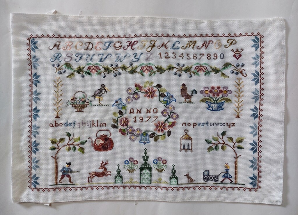 Gelukkig ook een hoop vrolijke randjes en bloemetjes, en al met al weer een gezellig lapje om tegenaan te kijken. Een ooievaar op één poot en een kraaiende haan hebben zich naar elkaar gekeerd maar kunnen elkaar niet in de veren vliegen want er hangen drie kransklokken tussen hen in en die luiden nog steeds 1977, terwijl het allang 2023 is. Tjonge, dat gaat er wel heftig aan toe hier in dit landje.
