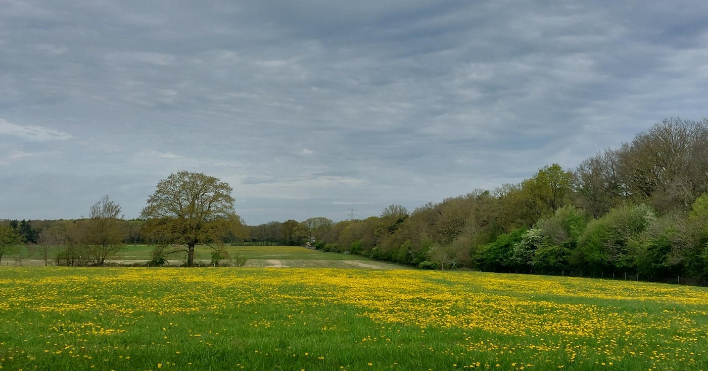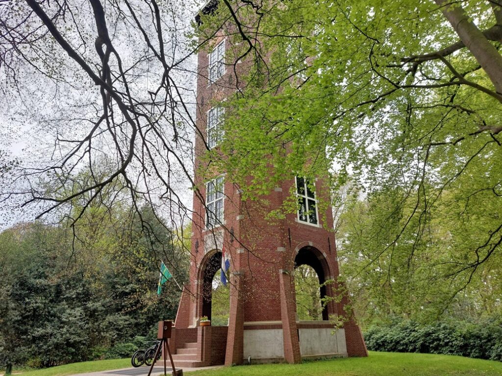Onze route loopt over de Goudsberg en nu de paardebloemen bloeien lijkt die inderdaad van goud. Op de top van de berg, midden in het Luntersche Buurtbosch, staat uitzichttoren De Koepel. Daar hebben we onze tweede pauze, want die heb je wel nodig als je twaalf kilometer loopt.