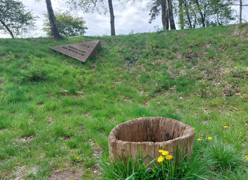 We lopen langs verschillende cultuurhistorische landschaps-elementen zoals deze (nagebootste) oude Romeinse put in een grote kuil die van zichzelf ook al een put is. Op die plekken ligt vaak een metalen driehoek die verwijst naar het middelpunt.