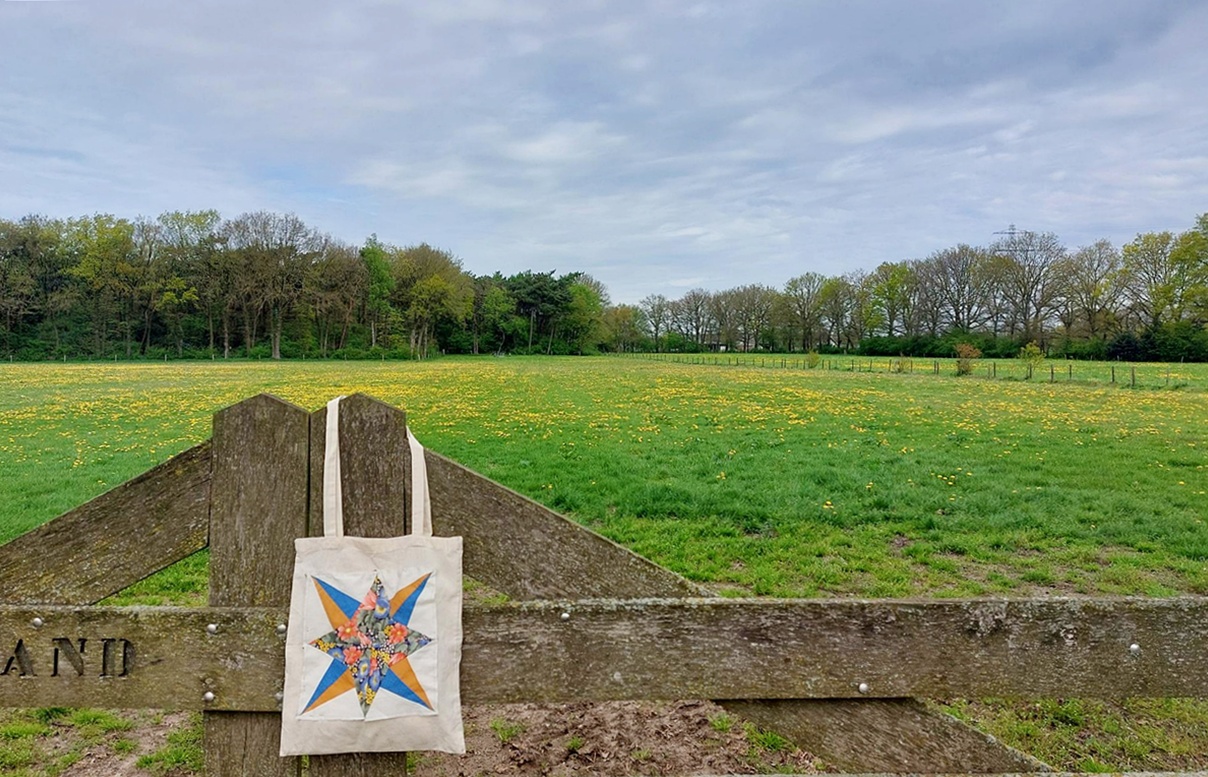 Bij de start van onze wandeling met een groepje andere wandelaars kwamen we bij het geografische Middelpunt van Nederland. Vlak voor vertrek had ik bedacht dat ik daarvoor iets bijzonders wilde meenemen voor een foto en had ik nog snel een kompas-blok op een katoenen tasje genaaid. Achter de steen zat iemand die het voor mij vasthield maar z’n hand heb ik weg gefotoshopt. Geen tijd om nog een rondedansje te maken rond de zwerfkei want de groep wil door.
